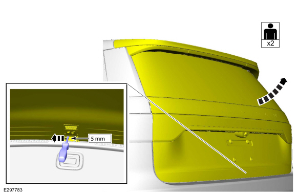 Slide the 3.5 mm wide flat-bladed screwdriver through the access cover opening 5 mm to the LH side of the slot. Releasing the liftgate latch and opening the liftgate.