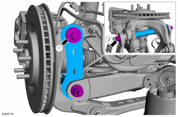 NOTICE: Tighten the suspension fasteners with the weight of the vehicle on the wheels and tires or use a suitable jack to raise the suspension to curb height or damage to the bushings may occur.